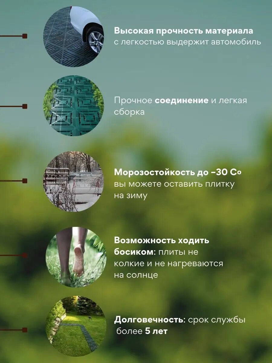 Плитка садовая PROTEX малахит - это лучшее решение для вашего сада, огорода или приусадебного участка. Простота и легкость сборки, минимальные усилия при соединении плитки. Садовую плитку можно укладывать прямо на грунт, песок, траву или укрывной материал. Плиты моментально высыхают, так как влага уходит в землю через щели. Морозостойкость до -30 - Вы можете оставить плитку на зиму, срок службы более 5 лет, поскольку производятся из высокопрочного материала, исключающего коррозию и ржавчину, стойкого к отложениям известкового налета. Прочное соединение позволяет выдерживать водяной поток во время ливня. Ваши садовые дорожки выглядят аккуратно и красиво на любом ландшафте и при любом стиле дизайнерского решения. Отличительные особенности PROTEX малахит от других покрытий: Возможность ходить босиком: плиты не колкие и не нагреваются на солнце, как гравий, щебень или битый кирпич, и не пачкают ноги, как песок. Не крошатся от воздействия погодных условий в отличие от бетонных блоков. Не скользко при намокании. Экологичность: корни растений продолжают дышать, растительный покров не страдает. Выдерживают давление до 2 т/м, что позволяет оборудовать парковочные места для тяжелых внедорожников и микроавтобусов. Функционально заменяют георешетку. В 8-10 раз легче каменно-цементных покрытий, что обеспечивает удобство при транспортировке, хранении и монтаже.