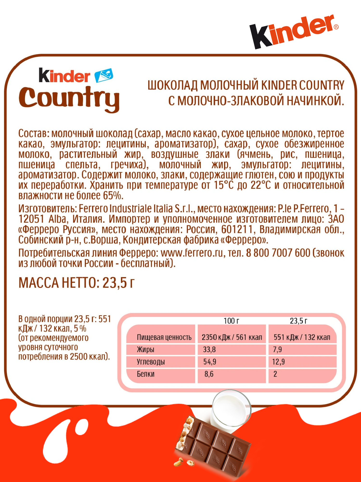 Купить Плитка шоколадная Киндер Кантри 23,5гр, 40шт/уп с доставкой по всей России. Плитка шоколадная Киндер Кантри 23,5гр, 40шт/уп: сравнение цен, характеристики, фото, актуальное наличие и цены.