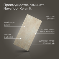 Плитка Novafloor Keramik обладает рядом преимуществ перед другими видами напольных покрытий. Она не боится влаги, что позволяет использовать ее в ванной комнате и на кухне. Плитка также уменьшает звуки при падении предметов или ходьбе, не скрипит и не скользит даже во влажном состоянии. Виниловый пол отличается неприхотливостью в уходе без загрязнения швов. Также кварцвиниловый пол принимает температуру окружающей среды в отличие от холодного керамогранита.