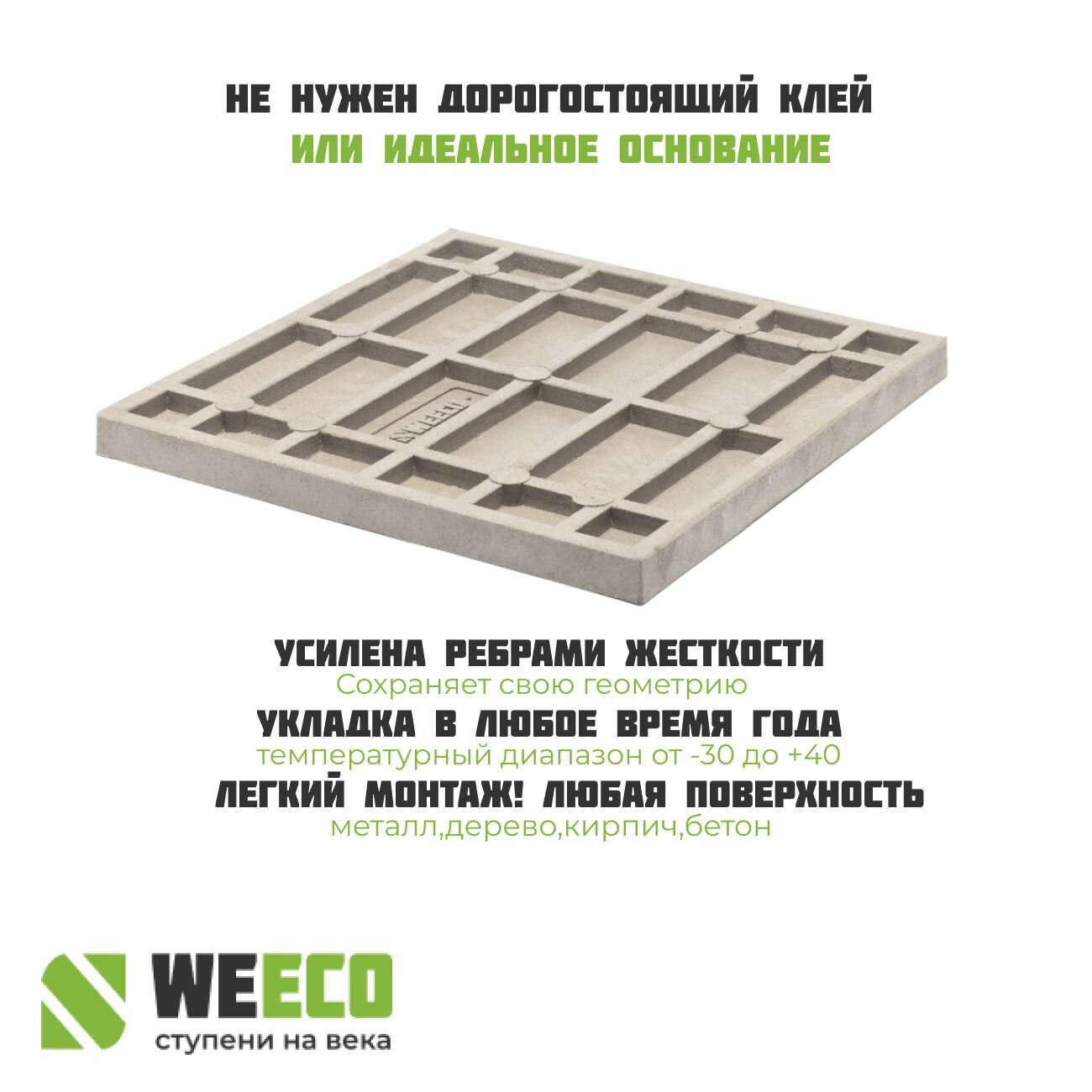 Разработанная нашей компанией форма ребер жесткости позволяет надежно закрепить плитку с помощью недорогих клеев на бетонном основании.