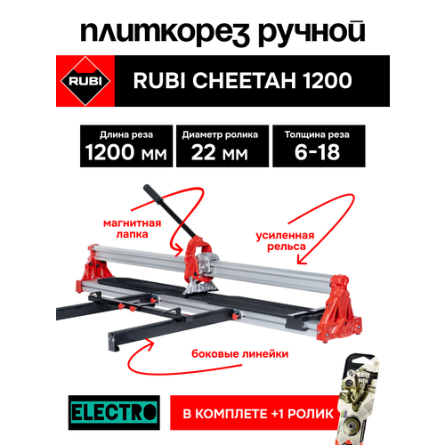 Плиткорез Rubi Cheetah, роликовый, прямой/диагональный рез, глубина пропила до 15мм, длина 120 см: сравнение цен, характеристики, фото, актуальное наличие и цены.