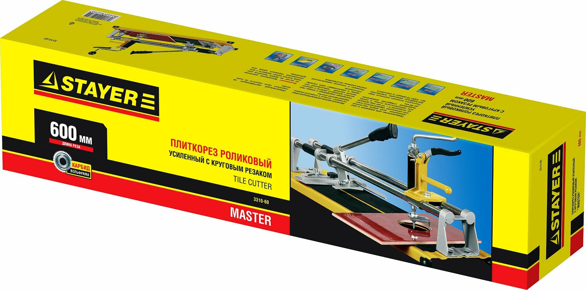 Плиткорез STAYER 3310-60 - ручной инструмент, который служит для прямого разрезания напольной керамической плитки толщиной не более 15 мм. Для проведения точного реза плиткорез оснащен выносной линейкой и угольником на 45 и 90 градусов. Данная модель позволяет прорезать в плитке круговые отверстия диаметром от 30 до 80 мм.