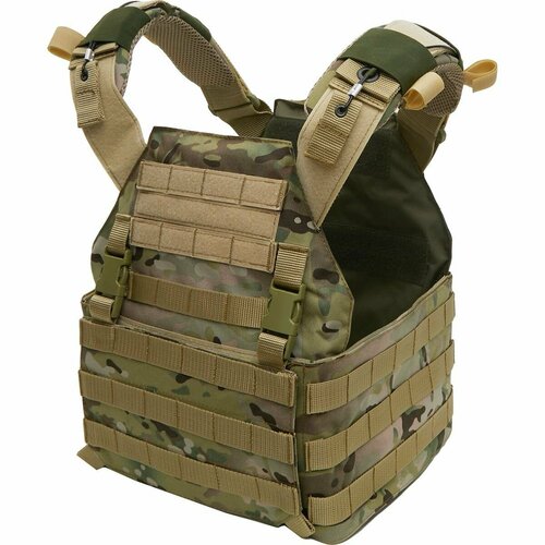 Легкий плитник с системой быстрого сброса от компании BASTION (Россия). Спроектирован под плиты Гранит 2 размера. Внутри нагрудной и спинной панелей идет отсек только под плиту, карманов под мягкую баллистику нет. На внутренней поверхности плитника (панели и камербанд) идут секции велкро ("ворс") для крепления КАП. Камербанд имеет отделения для установки баллистики. Размер отделений 26х15 см. КАП и бронеэлементы в комплект поставки не входят. Внешняя часть нагрудной и спинной панелей, а также камербанд, покрыты рядами ячеек MOLLE для установки снаряжения. Высота посадки плитника и объем в талии регулируются липучками. По размеру регулируется до ~56 размера. Камербанд (пояс) в основании имеет эластичные секции для плотной посадки по фигуре. Материал изготовления – нейлон.