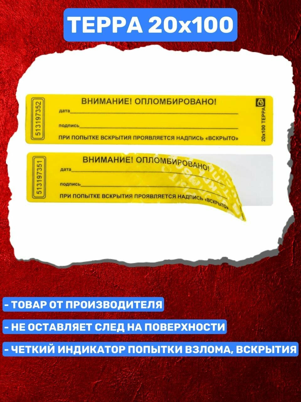 Наклейка Терра 20х100 подойдет для опечатывания любых поверхностей, не оставит следов, но обозначит факт вскрытия предупреждающей надписью на самой наклейке. Находят широкое применение, при опломбировании ценного имущества и лабораторного инвентаря, устанавливаясь на поверхности из металла, древесины, стекла, ДСП и кожзаменителя. Удаление пломбы не оставит следов на монтажной поверхности, но проявит на самой пломбе предупреждающий текст: "стоп, вскрыто!" — однозначным образом свидетельствующий о факте постороннего вмешательства. Примечательно, что любые попытки наклеить пломбу в исходное место и скрыть произошедшее не возымеют никакого результата. Высота 20 мм, Длина 40 мм, Температура установки от 0 до +45, Температура использования от -40 до +90. Безопасность, Для опечатывания, Защита, Надежность