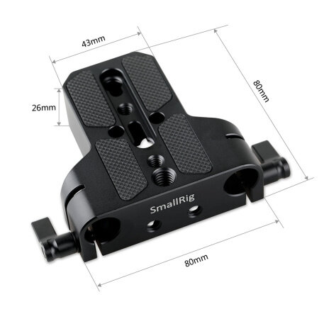 Небольшая и легкая площадка с креплением для 2 направляющих стержней 15 мм. Устанавливается на штативный винт 1/4"-20 или 3/8"-16, сверху ставится камера (гнезда 1/4"-20 и 3/8"-16). Направляющие фиксируются простыми зажимами, без необходимости использования специального инструмента. Хорошо подходит для крупных камер: линейки Canon EOS Cinema, Sony FS, Panasonic EVA и т. д. Может использоваться вместе с плечевым упором Sony FS7.