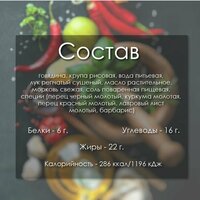 | Состав | говядина лопатка, перец сладкий замороженный, лук репчатый свежий, морковь свежая, паста томатная, соль поваренная пищевая, перец черный молотый |