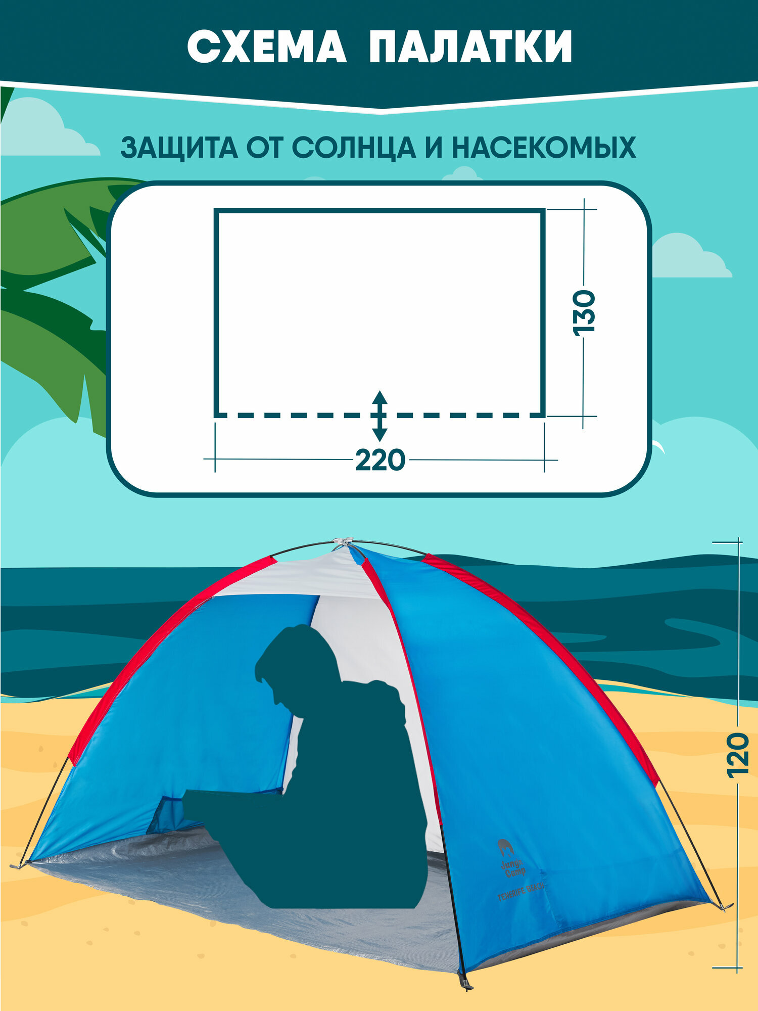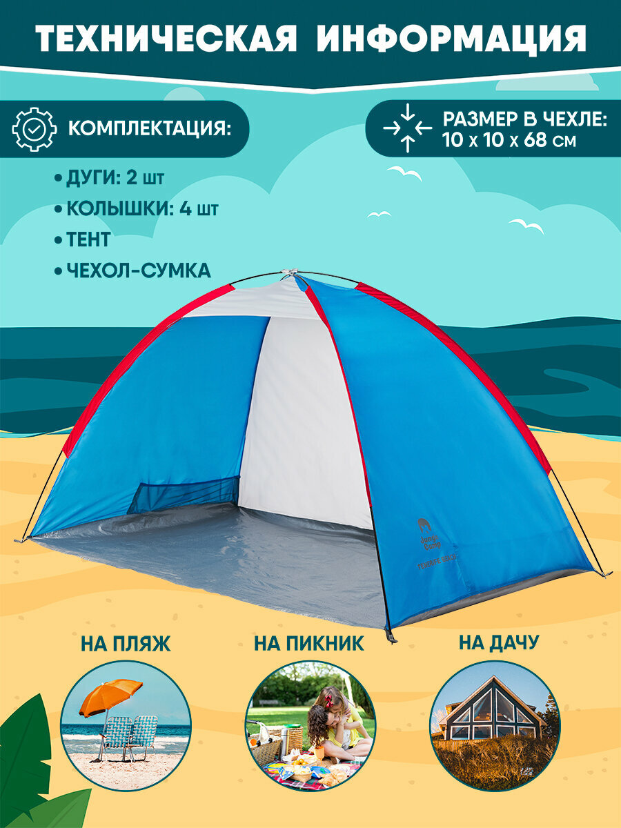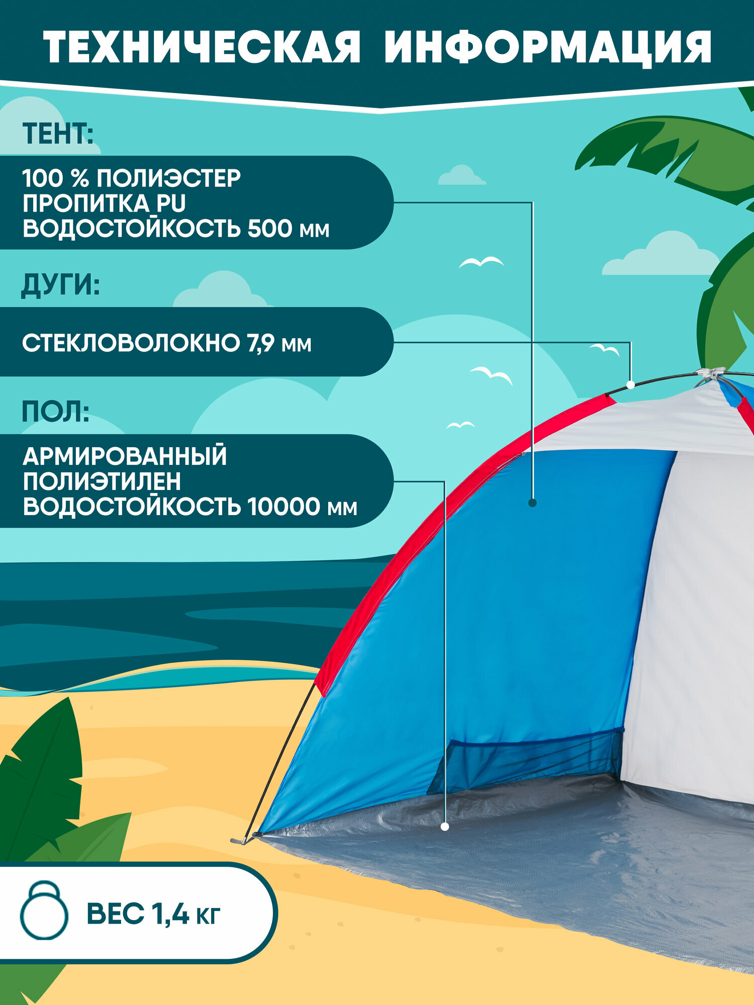 Простая и быстрая установка, Тент шатра из полиэстера, с пропиткой PU, за которым удобно укрыться от палящего солнца, Каркас выполнен из прочного стеклопластика, Дно изготовлено из прочного армированного полиэтилена, Карманы для мелочей по бокам тента, Растяжки и колышки в комплекте.
