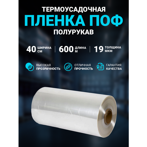 Пленка полурукав, ширина - 40 см, в развороте 80 см, длина 600 м, толщина 19 мкм.