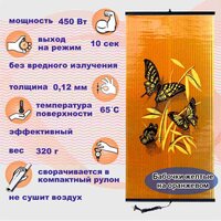 Цена снижена производителем из-за возможных незначительных отклонений по внешнему виду, не влияющих на работоспособность и защищенность изделия. Срок гарантии сохраняется. Пленочный настенный обогреватель "Бабочки жёлтые фон оранжевый" серии "Эконом" торговой марки "Бархатный Сезон" (Международная торговая марка "WOW") предназначен для создания зоны персонального комфорта радиусом 2,5-3 метра (около 14 кв. м). Плоский нагревательный элемент из сверхтонкой металлической ленты излучает ИК-волны длиной 10-13 мкм, что воспринимается человеческим организмом как "своё", а потому тепло приятно и эффективно. Увеличенная площадь излучателя тепловой энергии позволяет существенно повысить отдачу тепла по сравнению с остальными аналогами. Преимущества: – Отсутствие вредного излучения. – Защита от перегрева (встроенные термопредохранители). – Экономичность. За счет малой мощности потребления, незначительной собственной массы и большой поверхности тепло отдачи, позволяет снизить затраты на потребление электроэнергии на 15-35% по сравнению с традиционными обогревателями. – Безопасность для Вас и Ваших детей - температура на поверхности ниже ожогового порога. – Удобство при переноске и хранении (сворачивается в компактный легкий рулон). – Сверхбыстрый нагрев – выход на рабочий режим 10 секунд – Не сушит воздух и не сжигает кислород. – Разнообразие дизайна позволяет органично вписать обогреватель в любой интерьер.