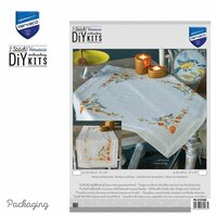 Скатерть с принтом и подшитой каймой. В наборе: ткань для вышивания: 100 % хлопок, пряжа 100 % хлопок DMC, органайзер для пряжи, инструкция на восьми языках, изображение изделия, на лицевом листе, игла. Напечатанный рисунок смывается. Размер: ок. 80 x 80 см. Возрастная категория: от 15 лет. Стежки: французский узел, крестик, длинный стежок, стебельчатый стежок. Количество цветов: 19. Сложность: умеренно легкая.