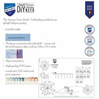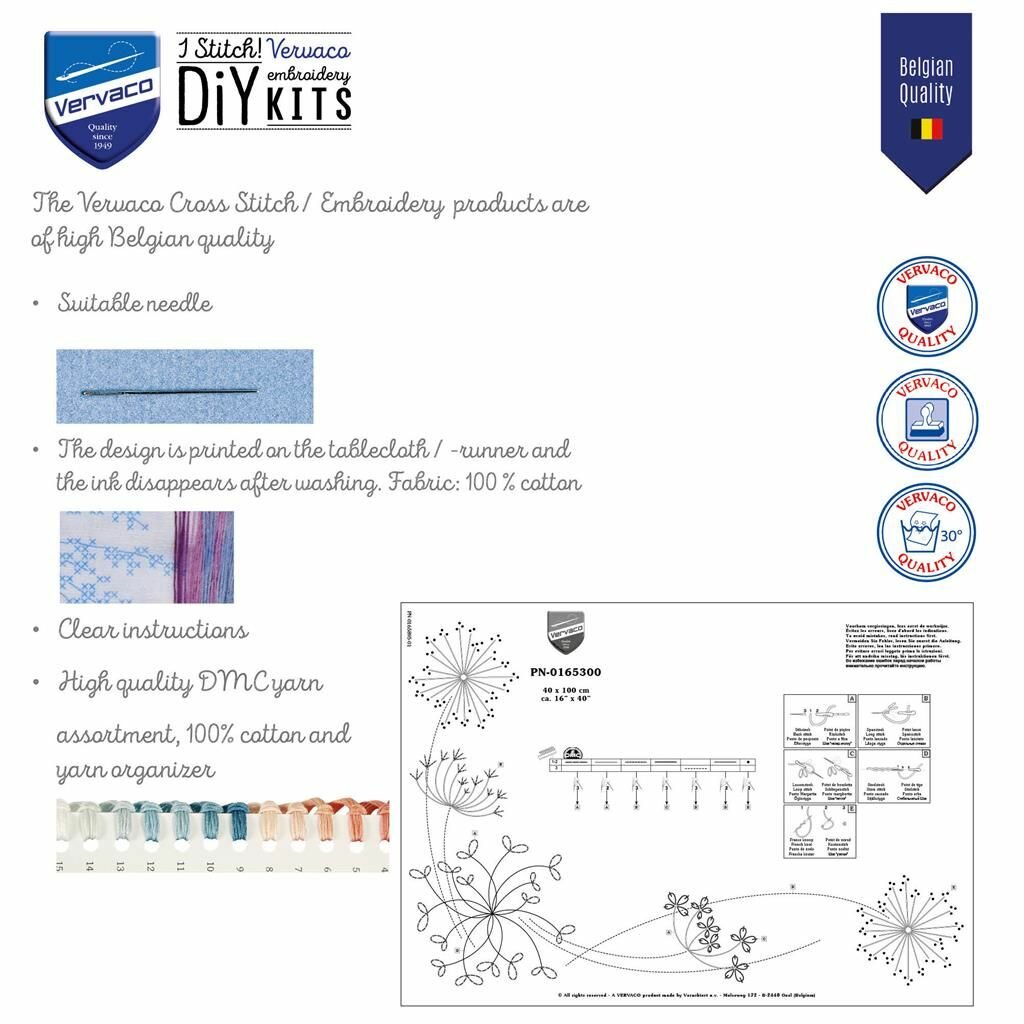 Дорожка с принтом и подшитой каймой. В наборе: ткань для вышивания: 100 % хлопок, пряжа 100 % хлопок DMC, органайзер для пряжи, инструкция на восьми языках, изображение изделия, на лицевом листе, игла. Напечатанный рисунок смывается. Размер: ок. 40 x 100 см. Возрастная категория: от 15 лет. Стежки: крестик, длинный стежок, стебельчатый шов, изнанка. Количество цветов: 15. Сложность: умеренно легкая.