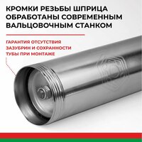 Специально разработанная крупная резьба защищает от срыва, позволяет всегда точно и быстро накручивать головку шприца на корпус. Закраины корпуса шприца обработаны на специальном фрезерном станке от зазубрин, которые присутствуют на аналогах и, как правило, могут повредить тубу при ее монтаже в шприц.