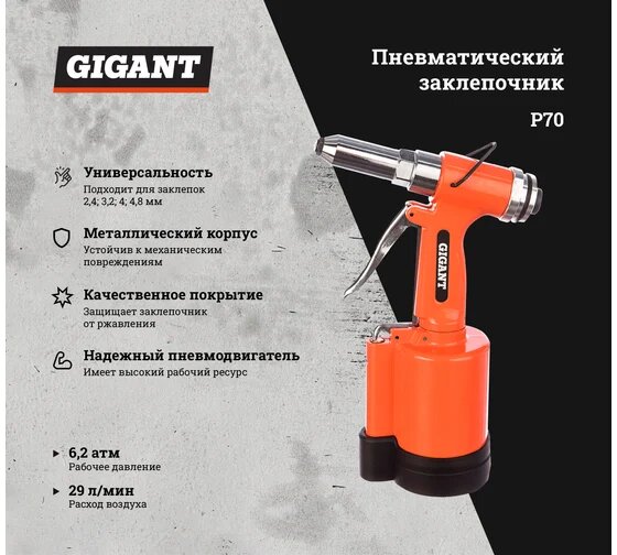 Купить Пневматический заклепочник (размер 2.4-4.8 мм; расход 29 л/мин) Gigant P70 с доставкой по всей России. Пневматический заклепочник (размер 2.4-4.8 мм; расход 29 л/мин) Gigant P70: сравнение цен, характеристики, фото, актуальное наличие и цены.
