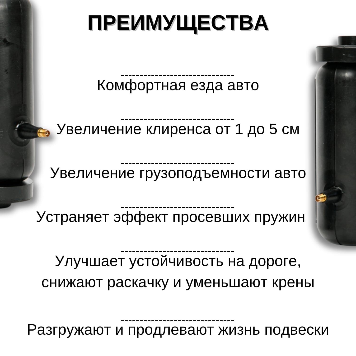 Пневмобаллоны предназначены для установки в стандартные пружины подвески и обеспечивают более гладкое и плавное движение автомобиля . Это позволяет улучшить комфорт при езде на заднем сидении, так как снижается вибрация и шум от работы подвески.