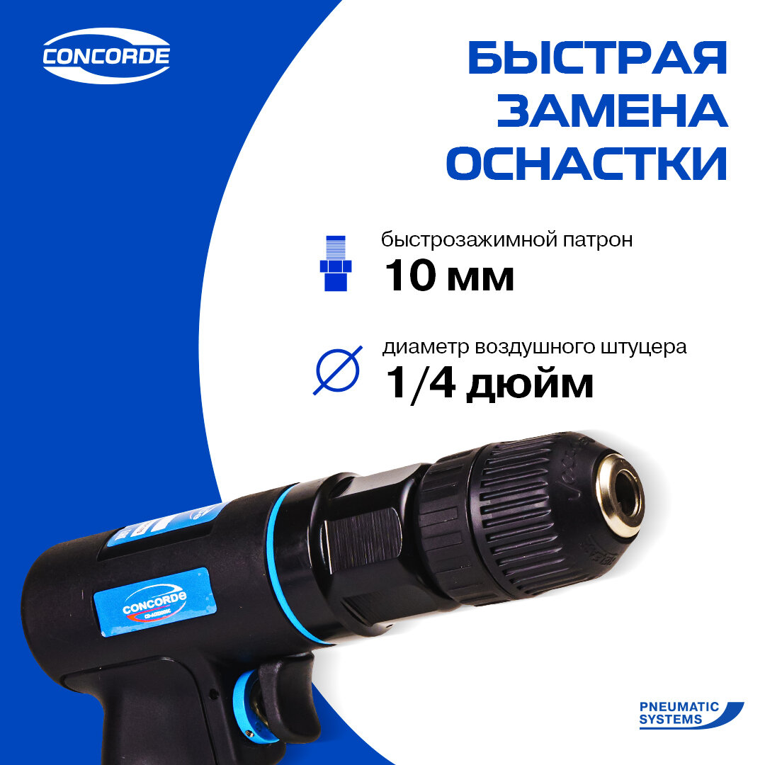Пневматическая дрель с реверсом REDVERG CD-AD2200SC — это надёжный инструмент для сверления отверстий в различных материалах. Идеальна для сверления в дереве, металле и пластмассе. Она оснащена надежным пневмодвигателем, который обеспечивает высокую производительность и долгий срок службы. Воздушный двигатель дрели пневматической пистолетного типа не чувствителен к перепадам температур, перегрузкам или перегреву, поэтому способен работать длительное время без потери эффективности. Реверс позволяет вращать патрон по ходу и против хода часовой стрелки, для выкручивания крепежа и извлечения подклинившего сверла. Пневмодрель имеет быстрозажимной патрон до 10 мм. Прорезиненная нескользящая рукоятка пистолетной пневмодрели обеспечивает надёжный хват инструмента. Ударопрочный корпус реверсивной дрели из композита защищает внутренние узлы от повреждений и продлевает срок службы инструмента. Пневматический инструмент легче электрической дрели, поэтому руки меньше устают. Данные модели получили самое широкое применение в сфере ремонта и обслуживания автомобилей, в машиностроении, в любительской практике. Широко применяются во время ремонтно-строительных работ, на мебельных и сборочных производствах. Отличный выбор инструмента для мужчины в подарок, пневмодрель для шиномонтажа, для мебели. Отличный подарок на новый год, день рождения, 23 февраля, а также как презент без повода для пополнения коллекции набора инструмента.