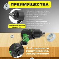 Технические характеристики: Максимальное рабочее давление: 6,3 бар; Расход воздуха: 210 л/мин; Максимальный крутящий момент (закручивание): 1300 Нм; Рабочий крутящий момент (закручивание в течение 3-5 сек): 950 Нм; Максимальный крутящий момент (откручивание): 1700 Нм; Скорости (% крутящего момента): 1 (50%) / 2 (85%) / 3 (100%); Число оборотов холостого хода: 7000 об/мин-1; Максимальный размер затягиваемой резьбы: М18; Ударный механизм: twin hammer; Размер присоединительного квадрата: 1/2"; Резьба ниппеля: 1/4" AG; Рекомендуемый диаметр воздушного шланга: 10 мм; Качество нагнетаемого воздуха: очищенный и обогащенный маслом; Масса: 2,0 кг; --- Комплектация: Пневмогайковерт; Сменные головки 1/2" - 3 шт (17 мм, 19 мм, 21 мм); Мини масленка; Ключ внутренний для болтов; Ниппель;
