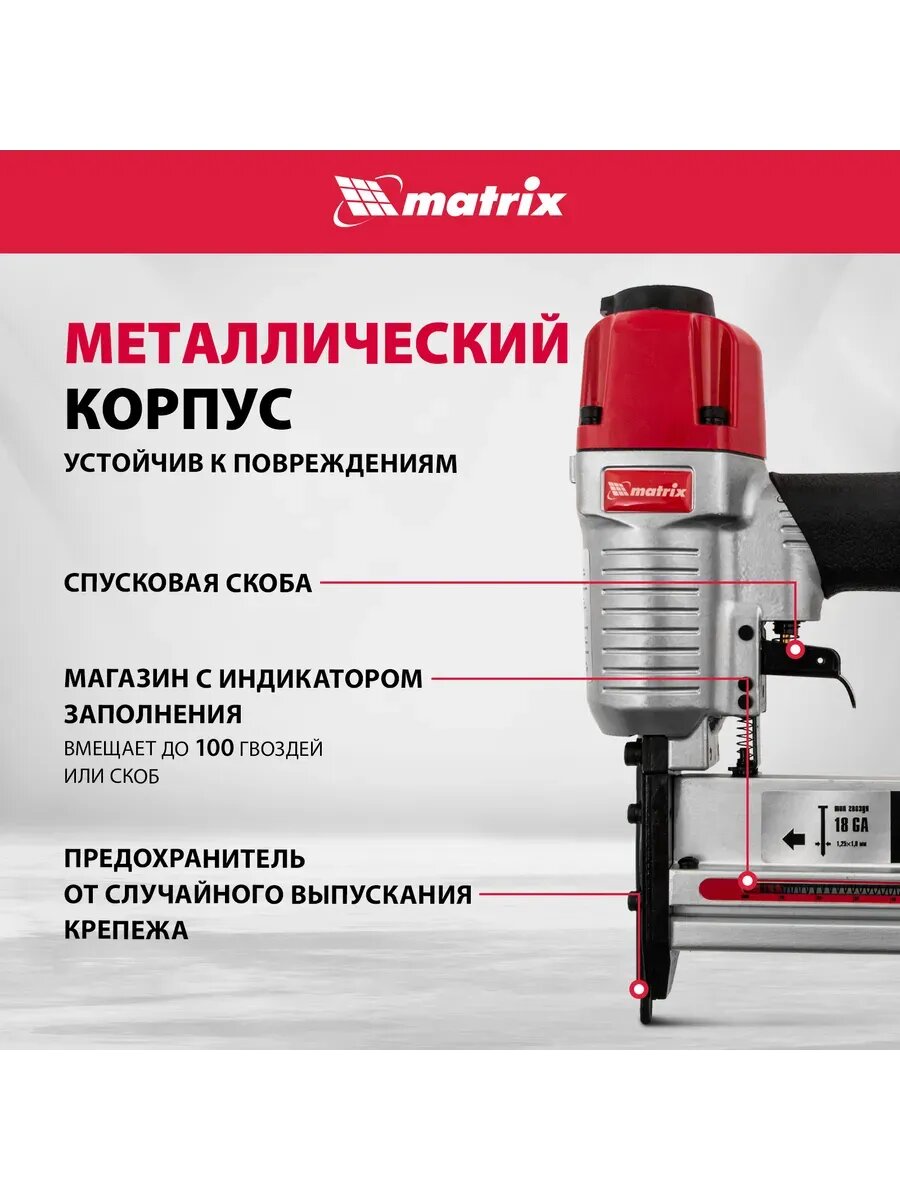 Представляем вам универсальный помощник для любых ремонтных и отделочных работ – пневмопистолет MATRIX 2 в 1! Этот мощный инструмент, работающий от сжатого воздуха, станет незаменимым в вашем арсенале. Представьте: вы легко и быстро закрепите плинтуса, обшивку, мебель, а также выполните множество других задач, требующих точности и надежности. MATRIX 2 в 1 – это не просто нейлер, а настоящий нейлер-степлер, который справится как с гвоздями, так и со скобами 18GA. Его вместительный магазин на 100 гвоздей и скоб позволит вам работать без перерывов, а металлический корпус гарантирует долгий срок службы. Обрезиненная ручка обеспечивает удобный хват и комфорт во время работы, а регулировка глубины забивания поможет вам добиться идеального результата. Индикатор заполнения магазина подскажет, когда пора дозарядить инструмент, а масленка и 2 имбусовых ключа всегда под рукой. MATRIX 2 в 1 – это идеальное сочетание мощности, удобства и функциональности. Не упустите возможность приобрести этот надежный инструмент по выгодной цене!