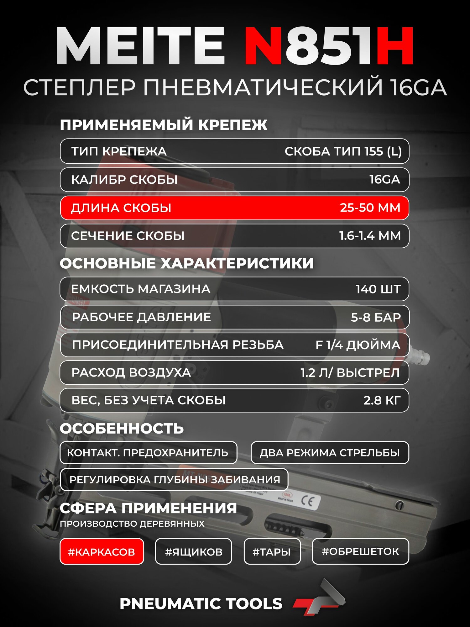 Скобозабивной пневматический пистолет meite MT-N851-H это промышленная модель инструмента для каркасных скоб большого сечения, "стреляющий" мебельной скобой калибра 16Ga, спинка 10,8 мм длина от 25 мм до 50 мм, Либо скобой калибра 17Ga спинка 10,5. Применяется в первую очередь при изготовлении мебельных каркасов, рамок, опбрешеток и прочих деревянных изделий в специально организованных местах как внутри помещений, так и на открытом воздухе с переменной влажностью и минусовой температурой. Высокая производительность. Степлер надежен и прост в эксплуатации, работа с ним не требует специальных знаний и навыков. Используемые скобы: тип M2 (M1), Bea 155, Prebena L (LM), Senco N