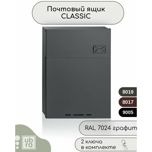 Металлический почтовый ящик - прекрасный вариант декора для Вашего дома. Нейтральный серый (графит) цвет ящика подойдет практически к любому цвету забора (RAL 7024). Разместите его на заборе у калитки или на стене дома. Он не ржавеет и не выцветает, выполнен из прочной стали и покрыт профессиональной порошковой краской. Ящик укомплектован металлическим замком с двумя ключами. Крепится на фасадной части дома к стене или к забору. Все крепления идут в наборе. Подойдет как необычный, но очень интересный подарок.