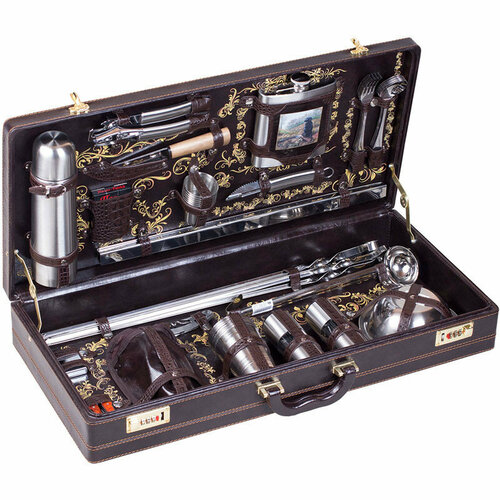 Шашлычный набор “Бивак” в кейсе на 6 персон (49 предметов) - это идеальный выбор для любителей активного отдыха и путешествий. Он включает в себя все необходимое для комфортного пребывания на природе: термос, фляжку, стаканы, тарелки, ложки, вилки, шампура, мангал, овощечистку, ножи, мультиинструмент, карты игральные и многое другое. Все предметы изготовлены из высококачественных материалов, таких как пищевая нержавеющая сталь и дерево (орех), что гарантирует их долговечность и надежность. Набор упакован в кейс из натуральной и искусственной кожи, который обеспечивает удобство хранения и транспортировки. Общий вес набора составляет 9,8 кг, что делает его достаточно компактным и легким для переноски. Ручная работа и уникальный дизайн делают этот набор не только функциональным, но и стильным аксессуаром для любого любителя природы. Комплектация: Термос из нержавеющей стали 0,5 л; Фляжка из нержавеющей стали 0,5 л; Стаканы из нержавеющей стали (12 штук); Тарелки из нержавеющей стали 500 мл (6 штук); Ложки из нержавеющей стали (6 штук); Вилки из нержавеющей стали (6 штук); Шампура из нержавеющей стали (6 штук); Мангал складной из нержавеющей стали; Овощечистка из нержавеющей стали; Нож консервный из нержавеющей стали; Нож из нержавеющей стали с рукоятью из ореха; Набор «Соль-Перец» из нержавеющей стали; Мультиинструмент складной; Половник из нержавеющей слали; Карты игральные; Лопата складная; Штопор сомелье;