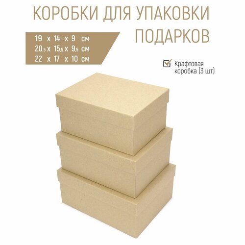 Набор из 3-х стильных крафтовых коробок с крышками. Легкие, прочные и практичные коробки изготовлены из экологически чистого микрогофрокартона и обклеены сверху плотной крафт бумагой. Эти изящные коробки идеально подходит для упаковки подарков и почтовых отправлений. Коробки аккуратно сделаны, хорошо выглядят и отлично впишутся в любой интерьер, как емкости для хранения мелких вещей, бижутерии, канцтоваров и т. д. Коробки изготовлены по схеме компактной «матрешки» (одна коробка помещается в другую) и несколько отличаются по размеру одна от другой. Самая большая коробка имеет внутренние размеры 22х17х10 см. Размеры двух других коробок: 20,5х15,5х9,5 см и 19х14х9 см. Существенным преимуществом этих коробок является то, что они поставляется в собранном, полностью готовом для использования виде. В состав данной поставки ленты и бумажный наполнитель НЕ входят. Дарите подарки друзьям и близким людям в качественной стильной упаковке!