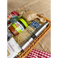 | Состав | Паста спагетти из твердых сортов пшеницы 500 г.; Соус бальзамический 150 мл.; Гуанчалле 125-150 г.; Песто Калабрезе из перцев и сыра рикотта 190 г.; Брускетта из артишоков 140 г.; Овощная смесь густоризо 280 г.; Флорентина с фисташкой и белым шоколадом 40г.; Мельница с чёрным перцем; Корзинка для продуктов и хлеба 34х24х7; Подробный рецепт приготовления пасты Карбонара |