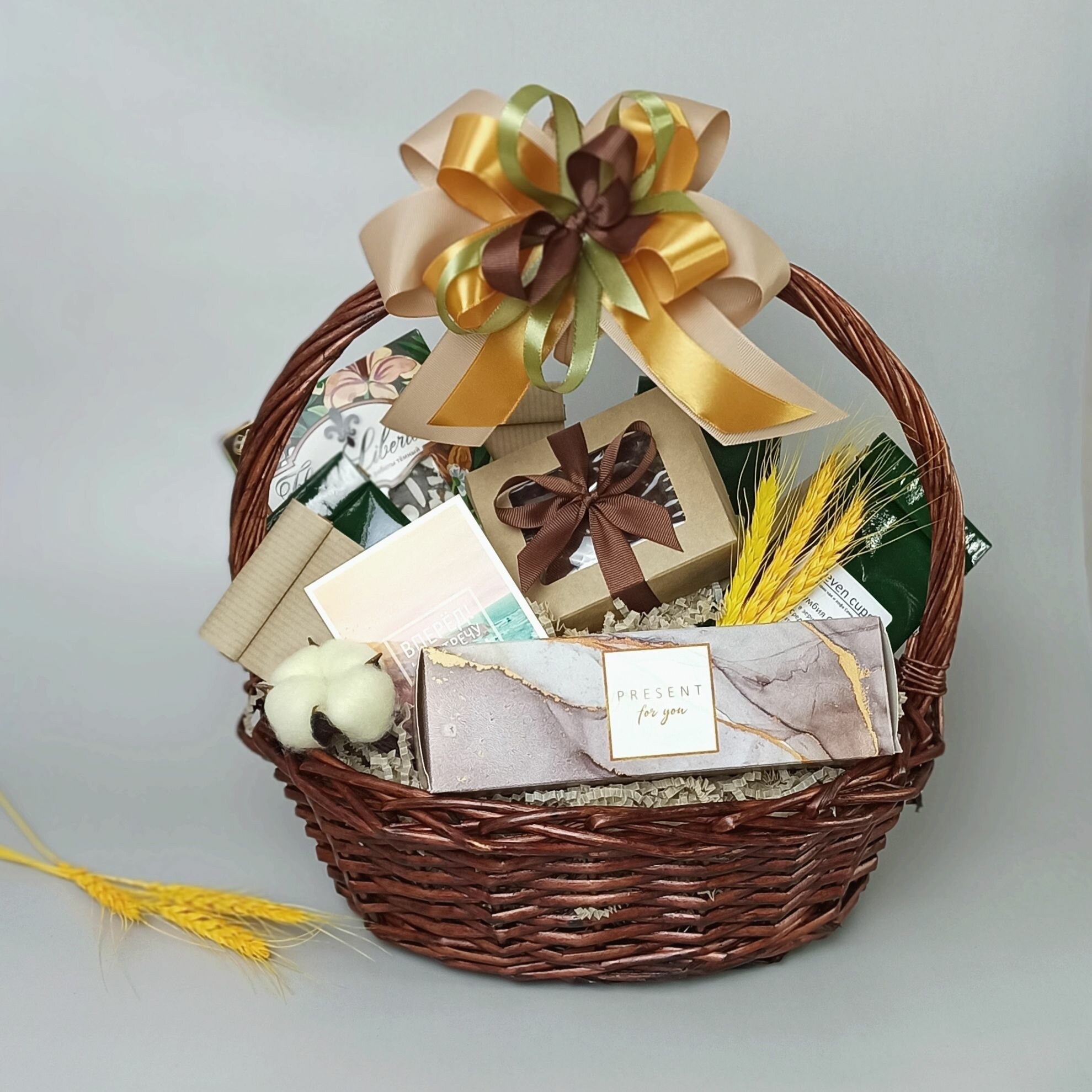 7. травяной сбор с мятой и душицей - 50 гр. 8. кофе в зернах арабика бразилия сантос - 80 гр. 9. кофе в зернах ароматизированная арабика венские вафли - 80 гр. 10. кофе в зернах ароматизированная арабика крем-карамель - 80 гр. 11. драже в молочном шоколаде - 80 гр. 12. драже в молочном шоколаде - 80 гр. 13. коробочка для драже с атласной лентой 14. корзина 15. сухоцветы