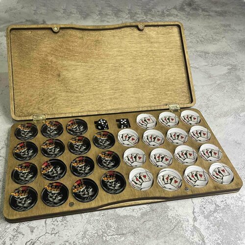 Фишки находятся в подарочной деревянной коробочке, которая изготовлена из натурального дерева - береза. Коробочка закрывается на магнитах. С фишками в комплекте идут кубики в количестве 2-ух штук.