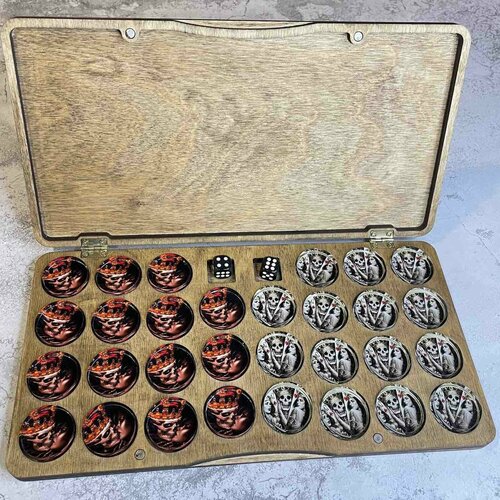 Фишки находятся в подарочной деревянной коробочке, которая изготовлена из натурального дерева - береза. Коробочка закрывается на магнитах. С фишками в комплекте идут кубики в количестве 2-ух штук.