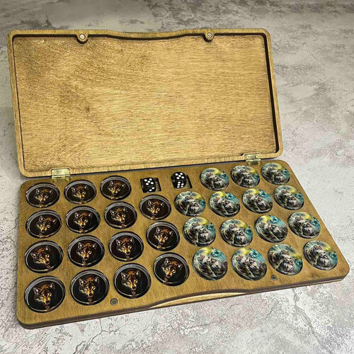 Подарочные фишки для нард из оргстекла "Ночные Волки" в коробочке из натурального дерева.
