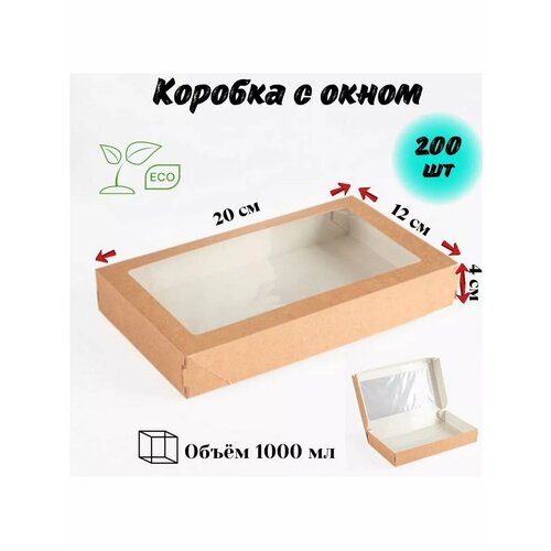 Крафт коробка с окном 1000 ml. Картонная эко коробка с окошком изготовлена из ламинированного картона, широко используется как одноразовый контейнер для десертов, для хранения продуктов и упаковки различных изделий. В комплект входит 200 сборных ламинированных крафт коробочек с окошком 1000 ml.