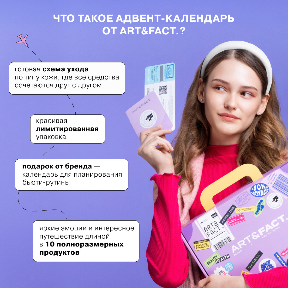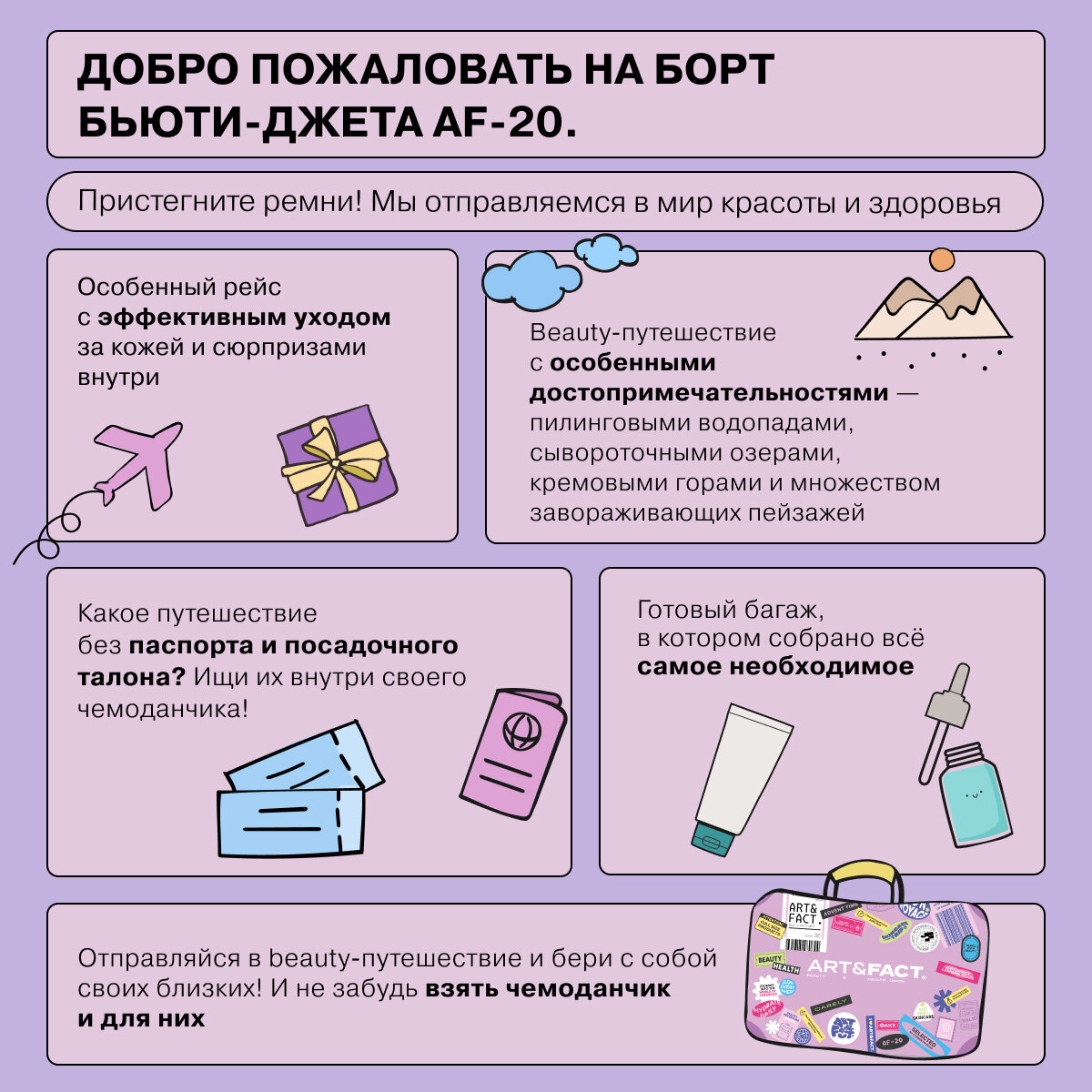 В этом году ART&FACT. отправляет тебя в настоящее путешествие в мир ухода, красоты и здоровья! Мы уже собрали всё, что понадобится тебе в этой поездке, в нашем косметическом уходовом наборе.