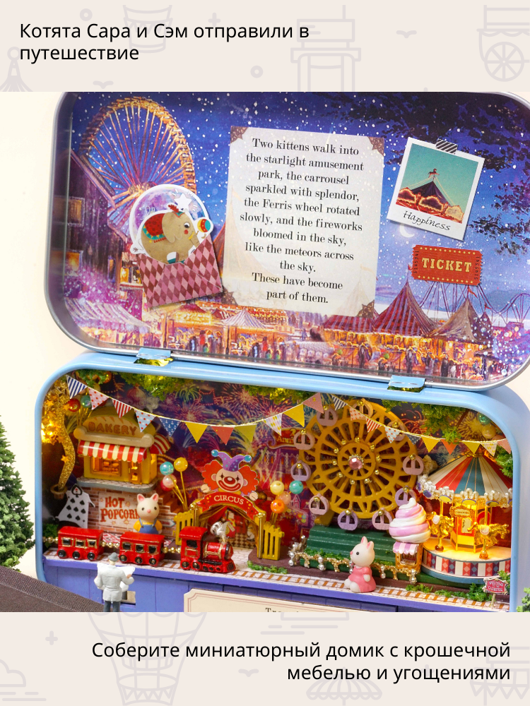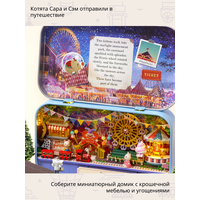 В наборе 150 деталей для сборки: деревянная мебель, ткань, искусственные растения, бусины, кружево, специальный клей, иллюстрированная инструкция на русском языке, металлическая шкатулка, пинцет, уютная подсветка, батарейки, фигурки котят Сары и Сэма, стильная деревянная подставка.