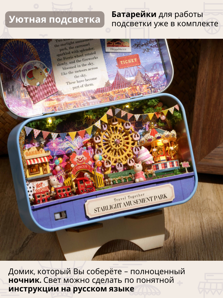 Сборка румбокса – прекрасная медитация, позволяющая отключиться от повседневной рутины. Рукоделие доставит лишь позитивные эмоции, ведь всё необходимое будет под рукой. Готовый парк можно использовать в качестве ночника благодаря уютной подсветке.