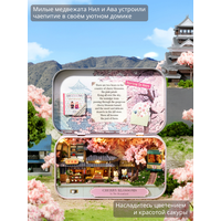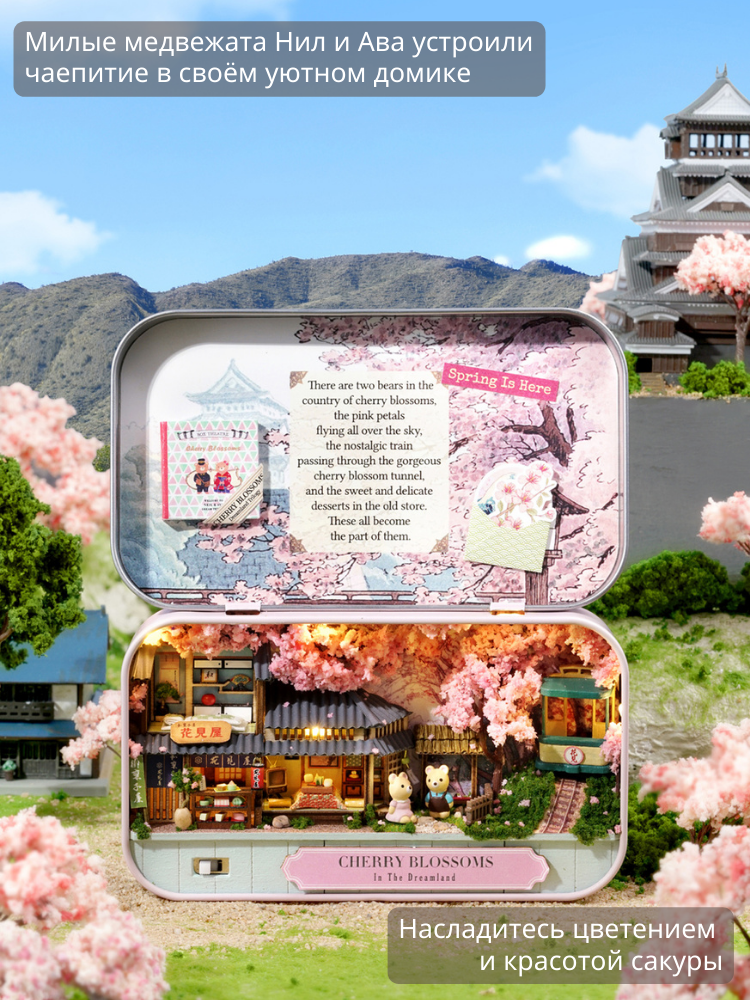 В наборе 80 деталей для сборки: деревянная мебель, ткань, искусственные растения, бусины, кружево, специальный клей, иллюстрированная инструкция на русском языке, металлическая шкатулка, пинцет, уютная подсветка, батарейки, фигурки медвежат Нила и Авы, стильная деревянная подставка.