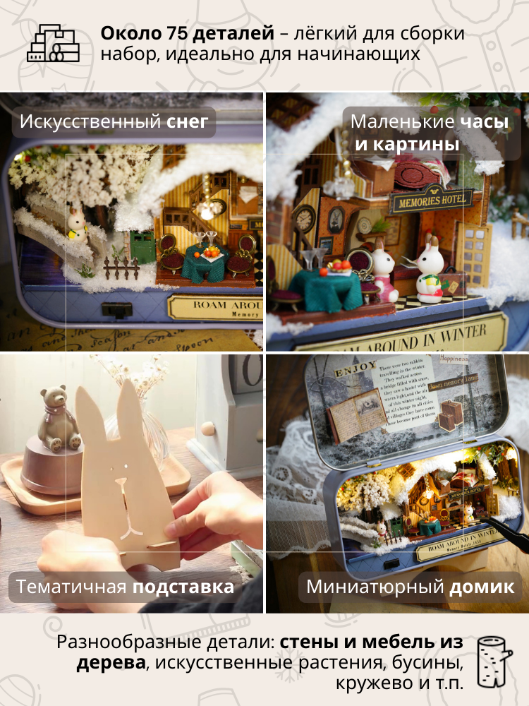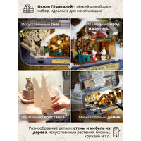 75 деталей для сборки: деревянная мебель, ткань, искусственные растения, бусины, кружево специальный клей, иллюстрированная инструкция на русском языке, металлическая шкатулка, пинцет, уютная подсветка, батарейки, фигурки зайчиков Гарри и Беллы и стильная деревянная подставка.