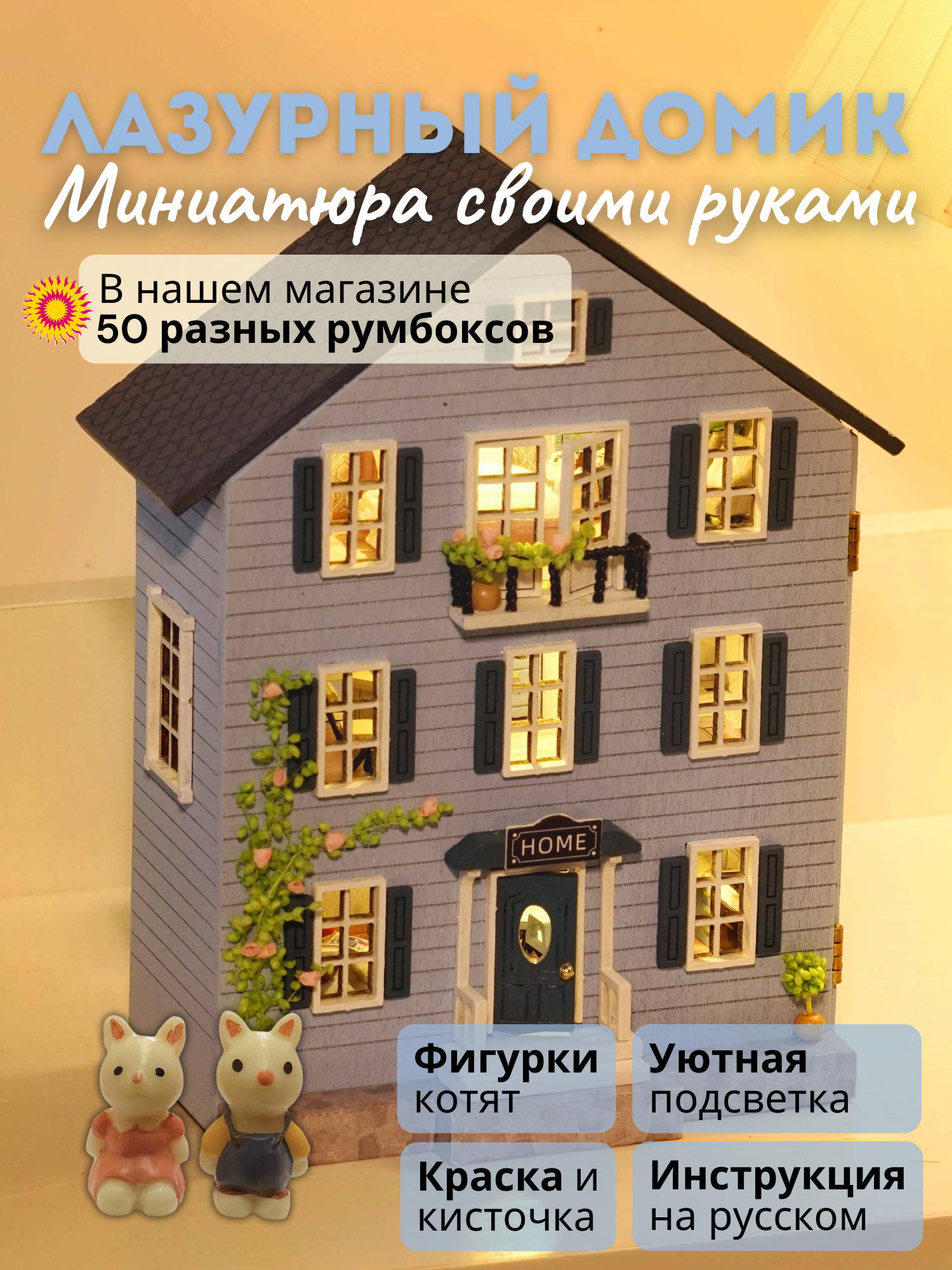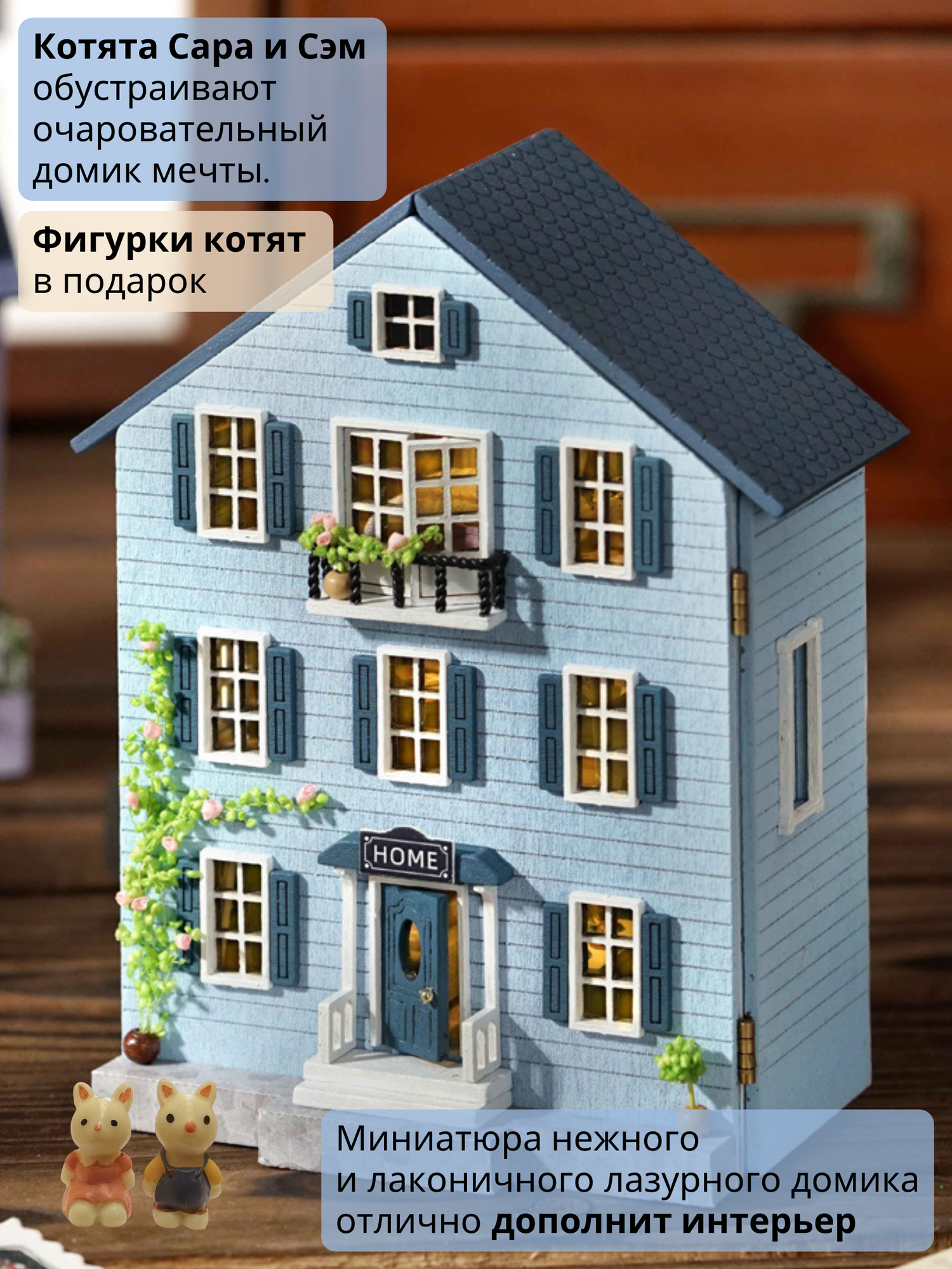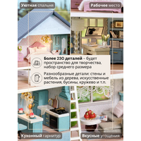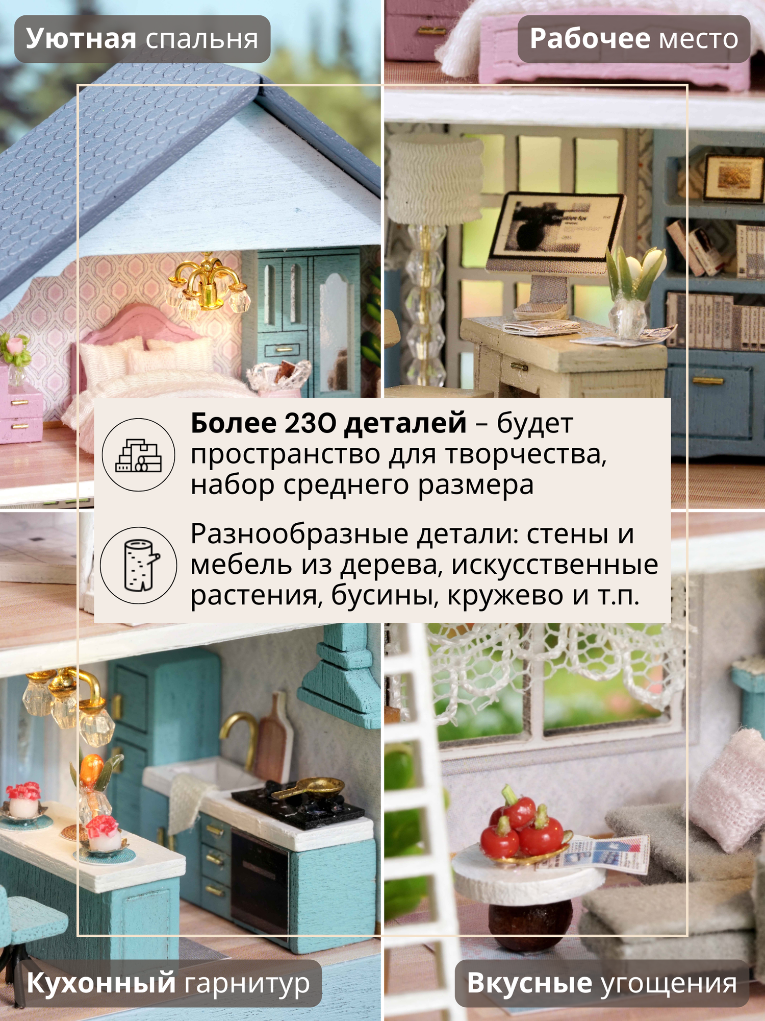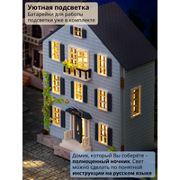 В наборе 230 деталей для сборки: деревянная мебель, ткань, искусственные растения, бусины, кружево, специальный клей, иллюстрированная инструкция на русском языке, пинцет, уютная подсветка, батарейки, фигурки котиков.
