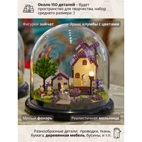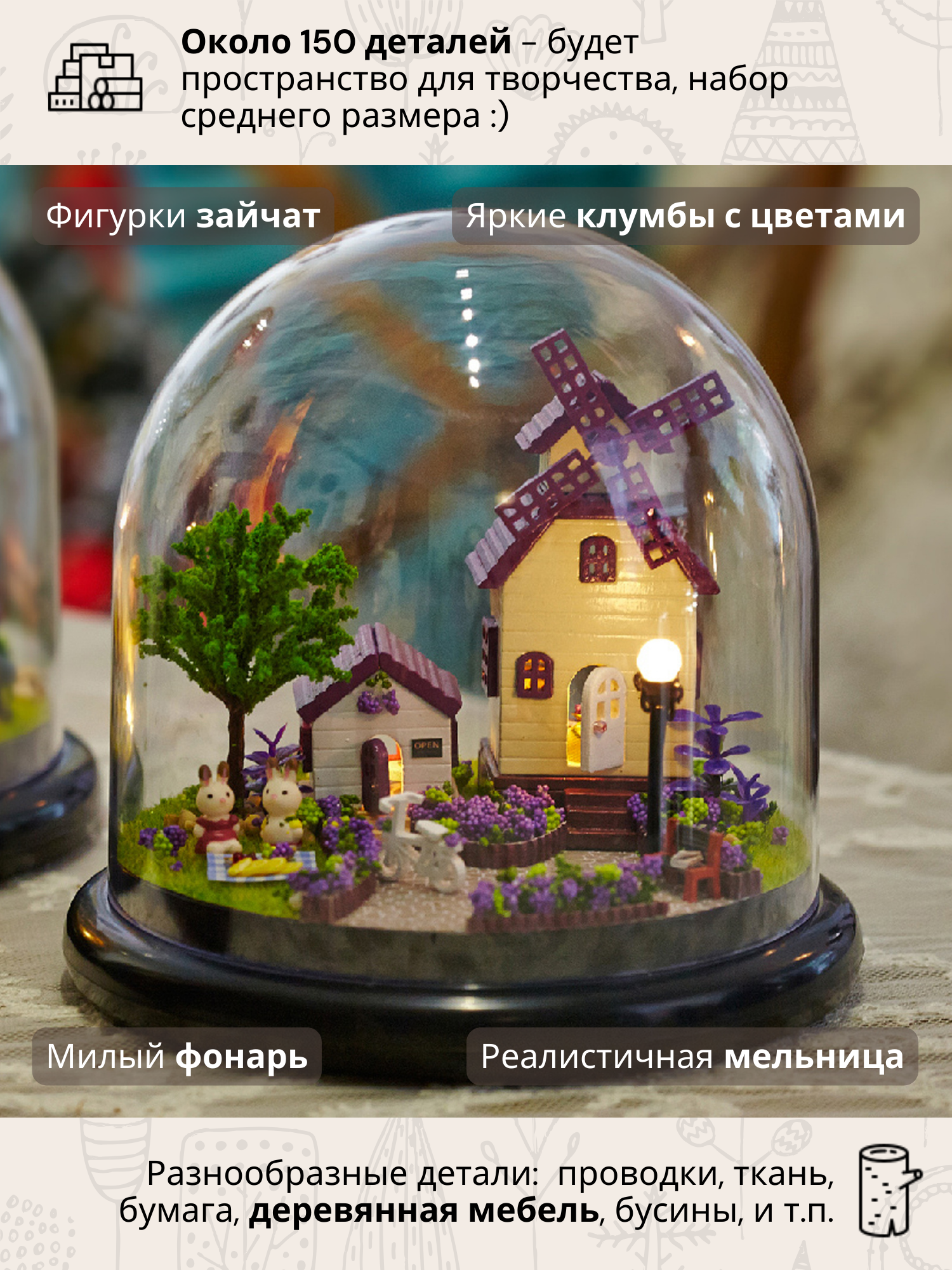 В наборе 150 деталей для сборки: деревянная мебель, ткань, бусины, кружево, , специальный клей, иллюстрированная инструкция на русском языке, пинцет, музыкальный механизм, уютная подсветка, фигурки зайчиков Гарри и Беллы, прозрачный купол для защиты от пыли.