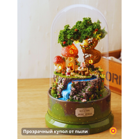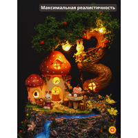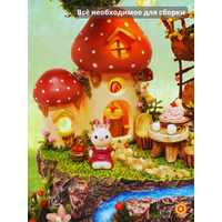 В наборе 120 деталей для сборки: деревянная мебель, ткань, керамика, бусины, кружево, специальный клей, иллюстрированная инструкция на русском языке, пинцет, музыкальный и вращающийся механизм, уютная подсветка, фигурки зайчиков, прозрачный купол для защиты от пыли.