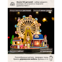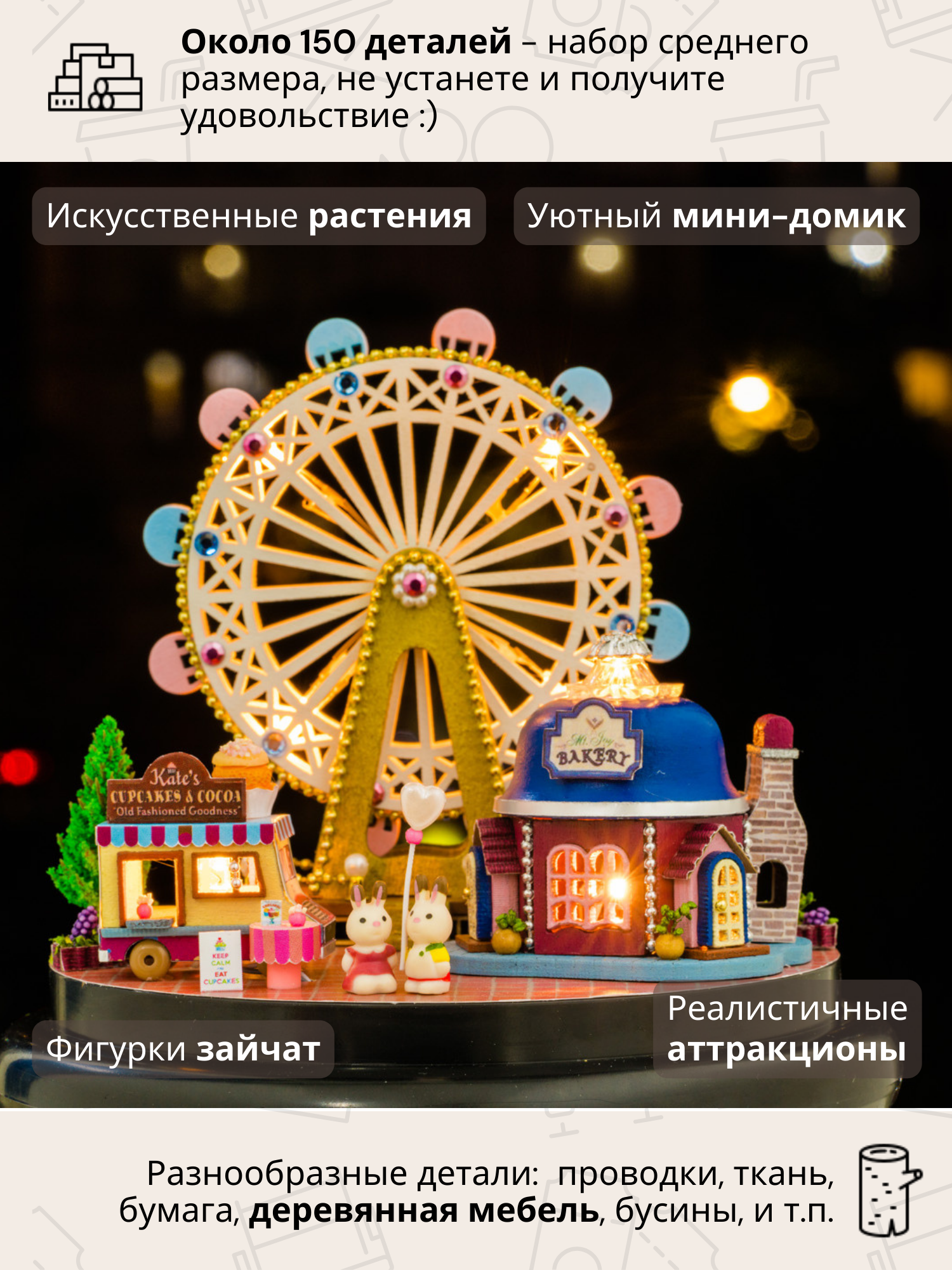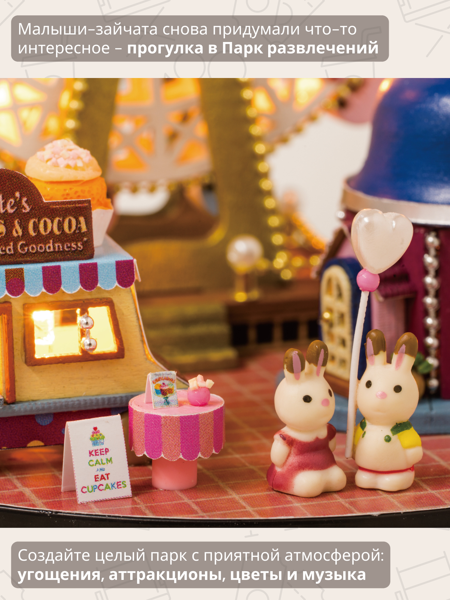В наборе 150 деталей для сборки: деревянная мебель, ткань, искусственные растения, бусины, кружево, специальный клей, иллюстрированная инструкция на русском языке, пинцет, музыкальный механизм, уютная подсветка, фигурки зайчиков Гарри и Беллы, прозрачный купол для защиты от пыли.