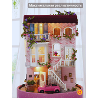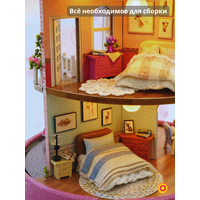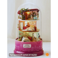 В наборе 170 деталей для сборки: деревянная мебель, текстиль, искусственные растения, бусины, кружево, специальный клей, иллюстрированная инструкция на русском языке, пинцет, музыкальный и вращающийся механизм, уютная подсветка, фигурка машинки, прозрачный купол для защиты от пыли.