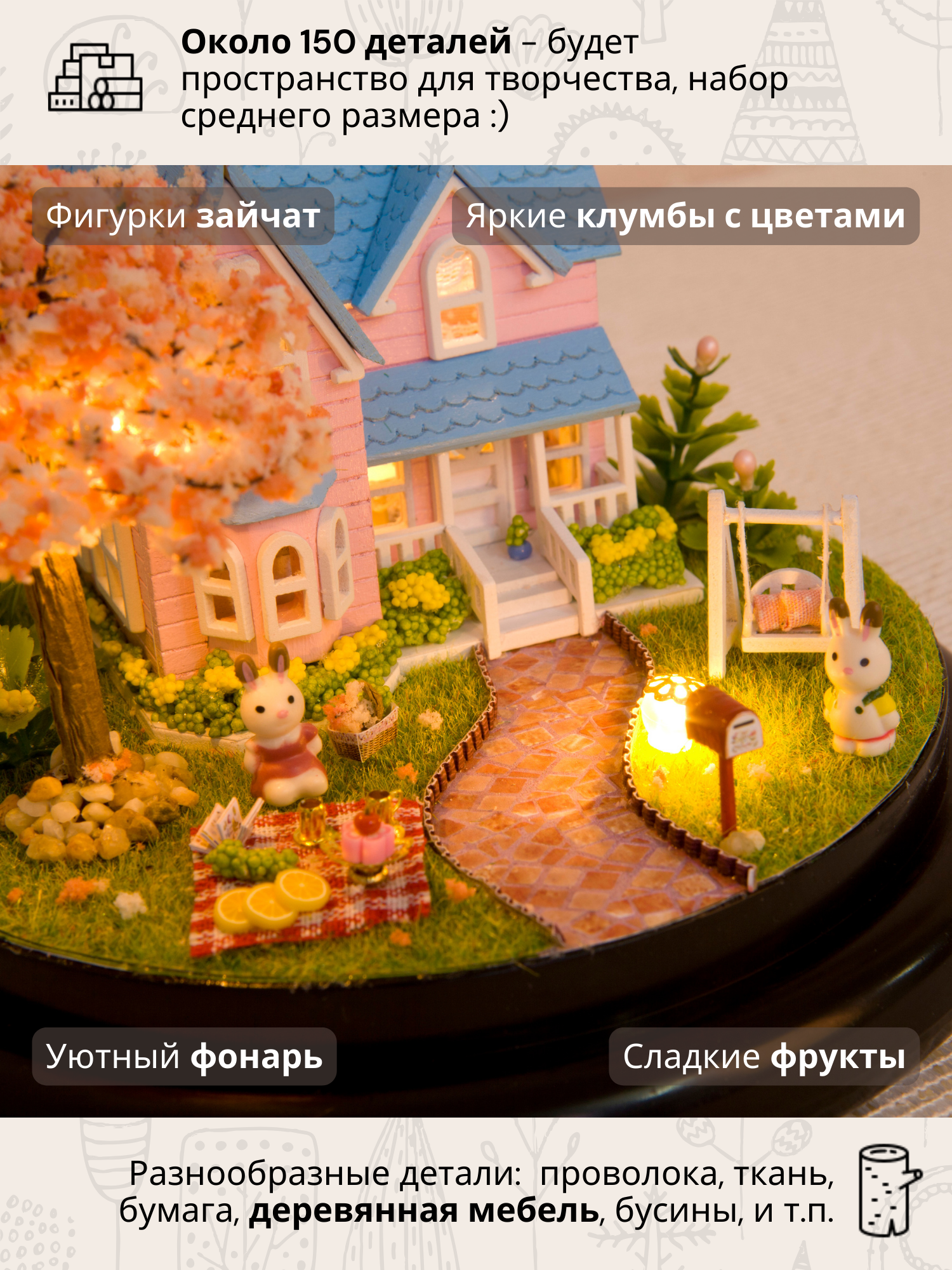 В наборе 150 деталей для сборки: деревянная мебель, ткань, керамика, искусственные растения, бусины, кружево, специальный клей, иллюстрированная инструкция на русском языке, пинцет, музыкальный механизм, уютная подсветка, фигурки зайчиков Гарри и Беллы, прозрачный купол для защиты от пыли.