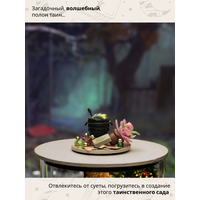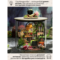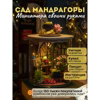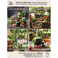 В наборе 170 деталей для сборки: деревянная мебель, ткань, искусственные растения, бусины, кружево, специальный клей, иллюстрированная инструкция на русском языке, пинцет, уютная подсветка, стеклянный прозрачный купол для защиты от пыли.