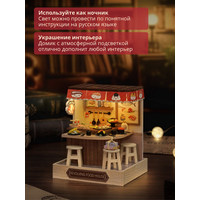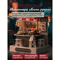 В наборе 90 деталей для сборки: деревянная мебель, ткань, бусины, кружево, специальный клей, иллюстрированная инструкция на русском языке, прозрачный купол для защиты от пыли, пинцет, уютная подсветка, батарейки.