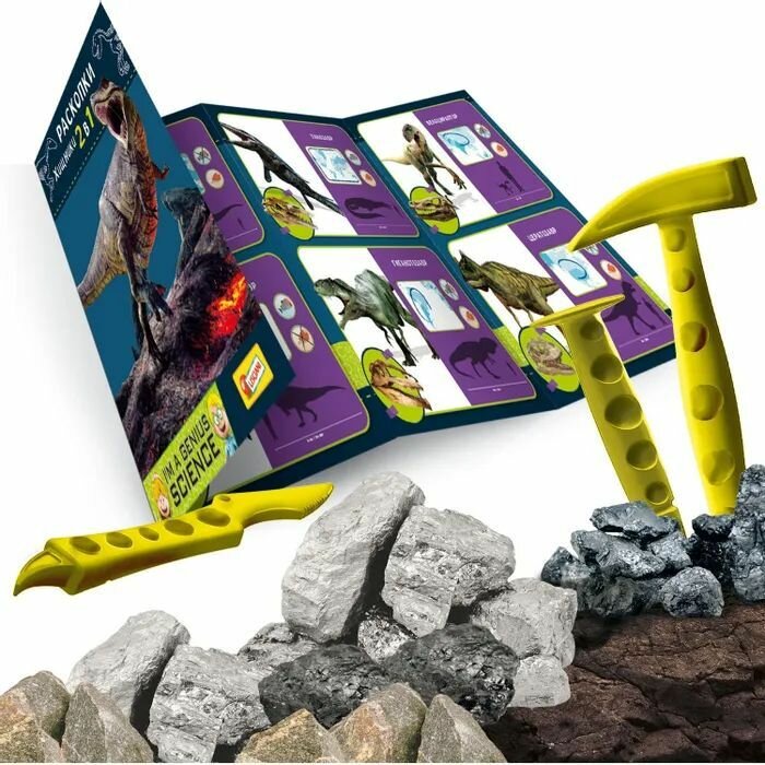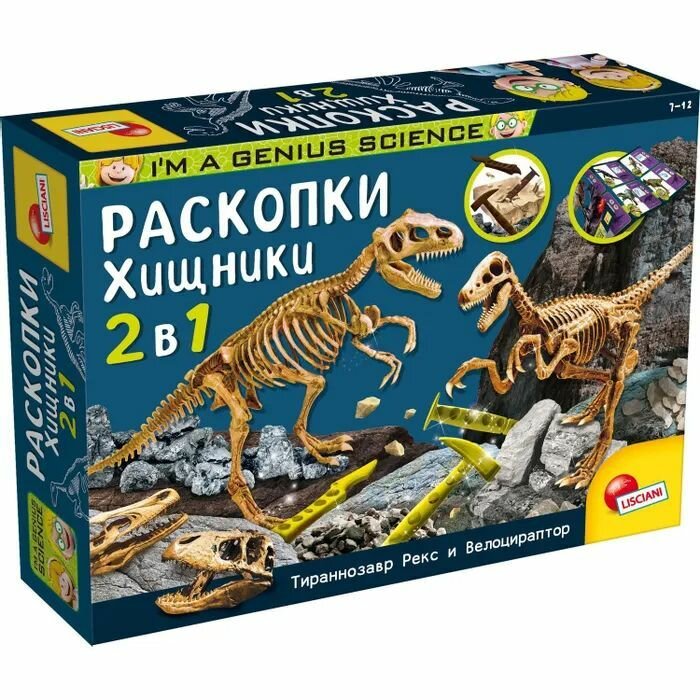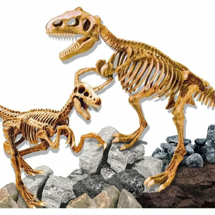 Откопайте из окаменелой гипсовой породы детальные копии скелетов самых опасных хищников, живших на нашей планете: гигантского Ти-Рекса и смертоносного Велоцираптора.