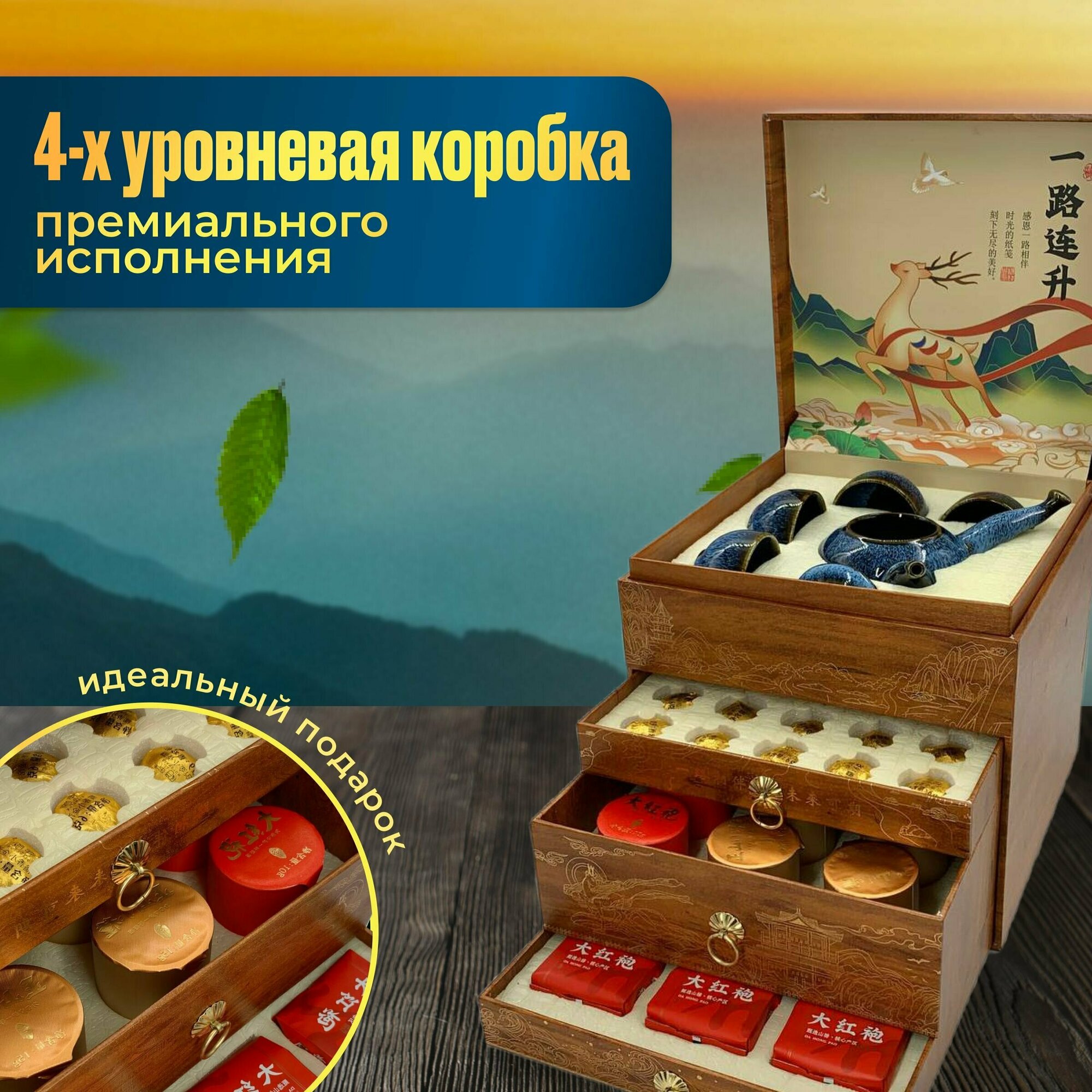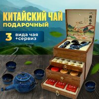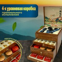 Красивейший и солидный набор ассорти листового китайского чая и сервиза для чайной церемонии - отличная и беспроигрышная идея для подарка как друзьям, так и коллегам, а также врачу, учителю, воспитателю, любому значимому человеку. Повод также может быть любой, будь то Новый год, 8 марта, профессиональный праздник, новоселье. Данный набор содержит: 12 баночек чая сорта Цзинь Цзюнь Мэй родом из провинции Фуцзянь. В переводе означает «Золотые Брови», чай появился на свет по чайным меркам не так давно, всего лишь в 2005 г, сразу же завоевал сердца любителей чая в Китае и постепенно освоил другие страны. Аромат цветочно-пряный, с проблесками медовых, мускатных, бисквитных и смородиновых оттенков. Вкус мягкий, очень чистый, плотный, чуть вяжущий, с проблесками цитруса и гречишного мёда и яркой бархатистой нотой характерной для Цзинь Цзюнь Мэй. Имеет приятное, продолжительное послевкусие. Прекрасный повседневный напиток. 25 прессованных порций чая Пуэр Сяо То, который с древних времен производится по особой технологии, сохраняющей целебные свойства растения. Сбор листьев проводится летом, в период их полной зрелости. Заваренный Пуэр Сяо То имеет красивый темно-янтарный цвет. Интенсивность оттенка зависит от времени выдержки сухого брикета. По мнению знатоков, Пуэр способствует стойкому похудению, быстро справляется с похмельем и пищевыми отравлениями, хорошо утоляет жажду. Пуэр успешно снимает депрессию, понижает уровень сахара в крови, ускоряет обмен веществ. Не зря его называют напитком красоты и молодости. Заваривание чая Пуэр – целое искусство. Китайцы называют спрессованное гнездо Пчелиным Ульем или Спящим Куполом. Освободив один брикет от упаковки, его заливают кипятком в глиняном чайнике. Гнездо распадается на «пчелиный рой». Заваривают гнездо до тех пор, пока не будет выбран весь чайный букет. Настоящие ценители пьют Пуэр без сладостей. Исключение можно сделать лишь для горького шоколада. 9 брикетов чая Чжоу Гуй, известного также под названием «Нефритовая корица». Этот чай выращивают на севере провинции Фуцзянь. Жоу Гуй был признан императорским чаем ещё в династию Цин, однако в самом Китае всенародная известность пришла к нему в середине 19 века, и по сей день У И Жоу Гуй считается одним из лучших утёсных улунов. Также в подарочном наборе в 4-х уровневой коробке премиального исполнения вы найдете чайный сервиз из чайника и 4 пиал для незабываемых чайных церемоний. Керамика гончарного мастерства Ды Хуа существует уже более 4000 лет. Местные умельцы создали первые глиняные тарелки и чашки ещё в эпоху неолита. В одноименном городе провинции Фуцзиянь сохраняют традиции создания керамической посуды уже множество веков. Интересно, что фарфор Дэхуа всегда был экспортным товаром и практически не поступал на внутренний рынок.