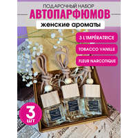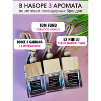 Набор автомобильных ароматизаторов воздуха состоит из ТОПовых ароматов известных брендов 3 L'Imperatrice D&G, Tom Ford Tobacco Vanille, Ex Nihilo Fleur Narcotique. Бочонки упакованы в подарочную деревянную коробку - шкатулку с натуральным древесным наполнителем. Каждый аромат из набора будет раскрываться и наполнять ваш автомобиль своим неповторимым и уникальным запахом. Красивый прозрачный флакон с деревянной крышкой на шнурке, отлично впишется не только в салон автомобиля, но и будет элегантно смотреться в интерьере комнаты, офиса или гардеробе. Флакон можно подвесить в удобное место размещения или просто поставить. В составе всех наших ароматизаторов для авто только масла из Франции без содержания спирта. Запах при этом стойкий и мягкий, в отличие от резких освежителей воздуха, в вашем авто будет чувствоваться лишь легкий приятный аромат автопарфюма. Такой набор будет прекрасным подарком для автомобилиста, водителя, автолюбителя.