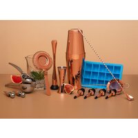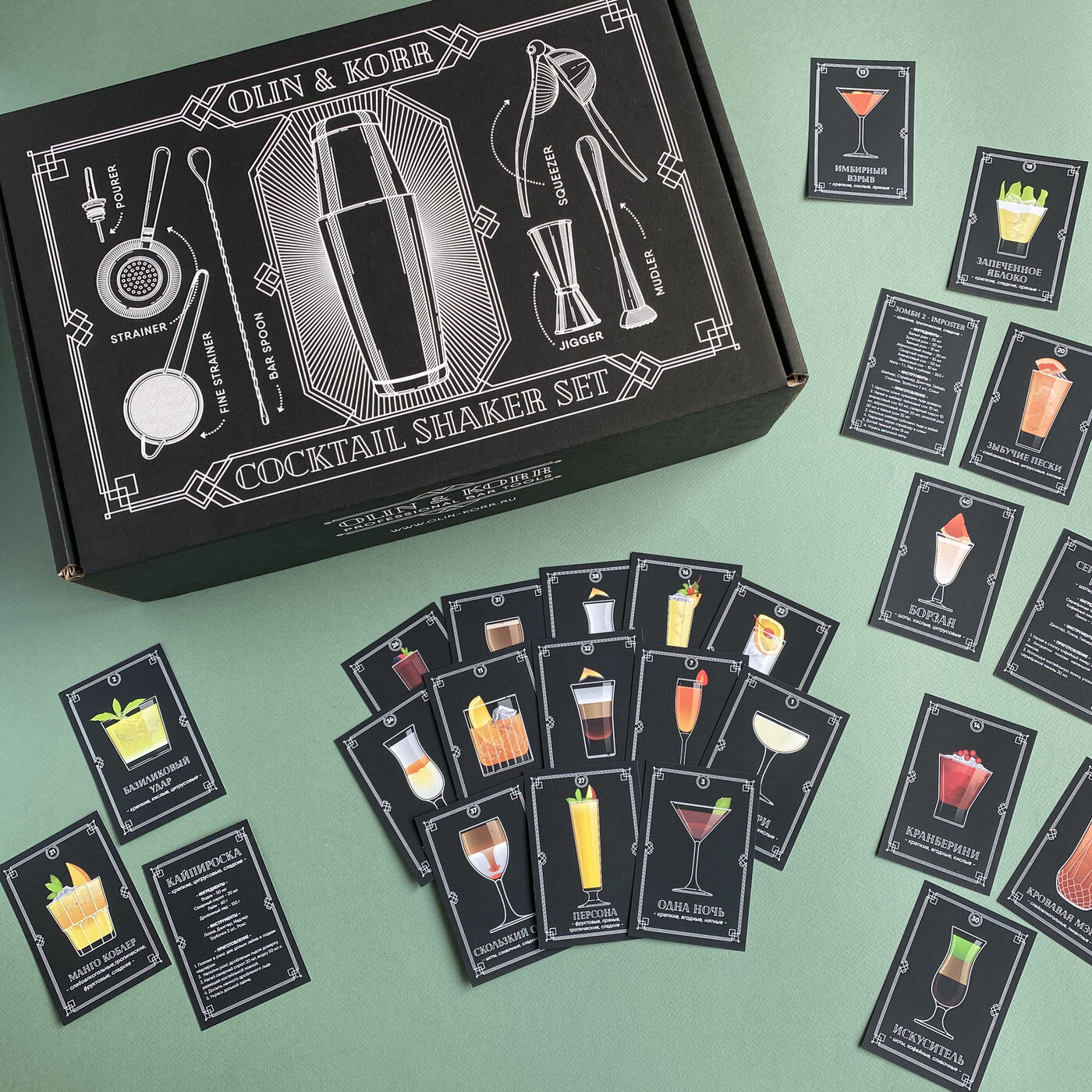 Бостонский шейкер — смешивает и охлаждает. Объём стаканов 750мл + 550 мл. Стаканы с утяжелителями для лучшего шейка и жесткого хвата. Джиггер в японском стиле 50/25мл с насечками внутри 35/15мл — отмеряет количество жидкости, сохраняет правильную пропорцию ингредиентов. Смесительный стакан 725мл — в нём смешивается, охлаждается и при необходимости обводняется содержимое перед подачей в бокал. Хавторн стрейнер — отфильтровывает лёд. Файн стрейнер — мелкое ситечко для двойной фильтрации. Гейзер 4 шт. — делает поток жидкости из бутылки управляемым. Барная ложка — смешивает содержимое в глубоком стакане + используется как мерник 5 мл. Её длина 40 см, а с другого конца форма капли — специально для того, что бы ей быстро пробраться через лёд ко дну стакана. Красочная барная карта, инструкция и рекомендации по уходу за инвентарём. 40 ярких карточек с рецептами коктейлей в виде игральных карт. Фирменная коробка Olin & Korr.