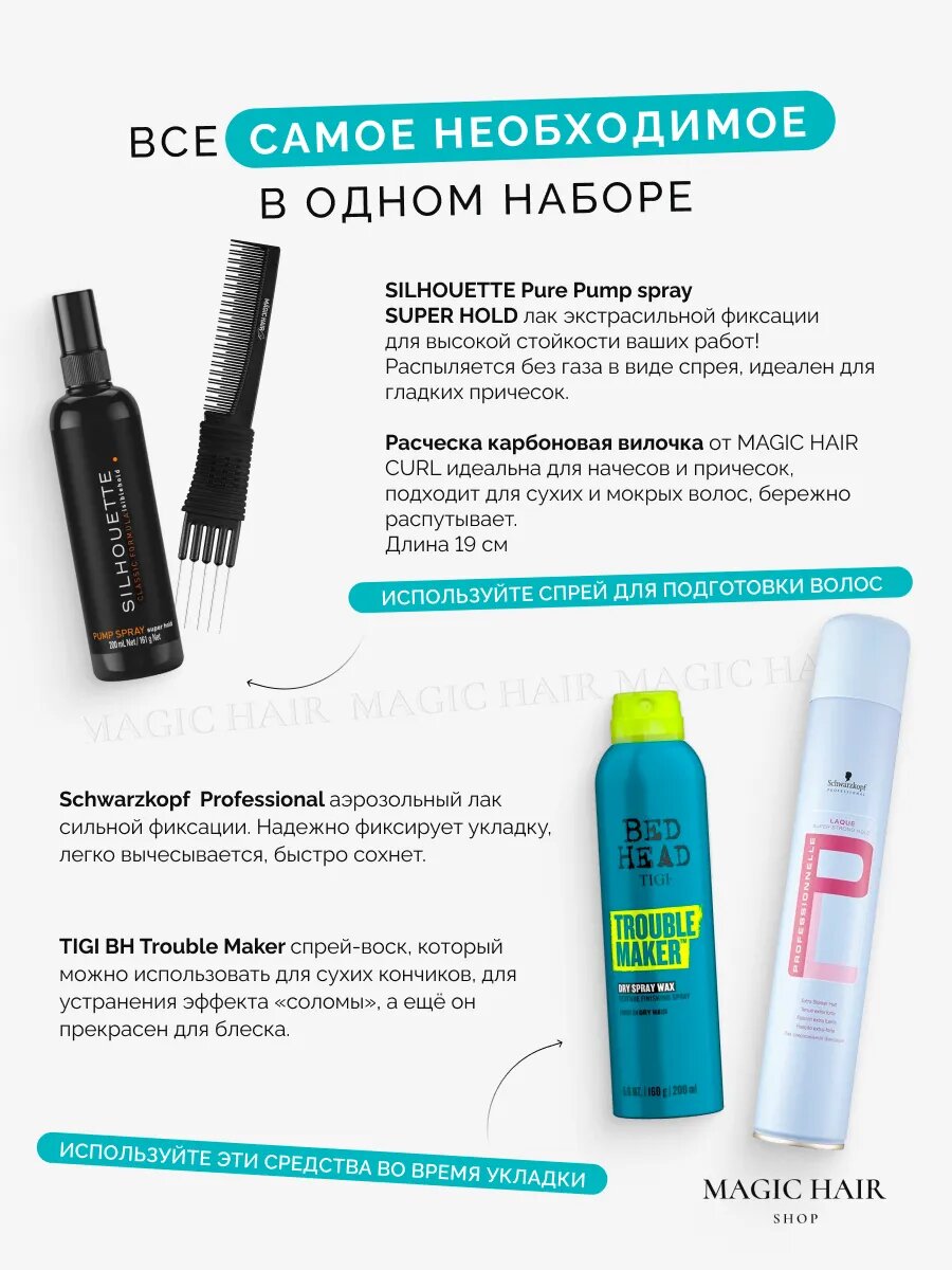 Внимание! Цвет И модель расчески может меняться! Не знаете какой оригинальный подарок или набор подарить подруге? Подарочная коробка для волос отличная идея для девушек на 8 марта, день рождение или просто так. Бьюти набор включает в себя следующий стайлинг: 1) Популярный голубой лак Schwarzkopf PROFESSIONNELLE. Обеспечивает длительную фиксацию кудрей, быстро высыхает и легко вычесывается. 2) Жидкий лак SILHOUETTE, который распыляется без газа в виде спрея. С приятной отдушкой и УФ - защитой. Обладает сильной и экстрасильной степенью фиксации. Придает шикарный блеск, эластичность и высокую стойкость. 3) TIGI BH STYLE TROUBLE MAKER DRY SPRAY WAX, спрей-воск для блеска и текстурирования 200 мл 4) Профессиональная плойка 25 мм поможет легко сделать укладку и накрутить локоны любом месте. Плойка с гальваническим покрытием пластин обеспечивает плавное скольжение, опрятный и ухоженный вид; 5) Расческа Magic Hair Curl вилочка карбоновая. Косметический набор для локонов имеет в наборе 5 различных средства. Бокс с косметикой для волос ( Beauty Box ) всегда актуален для женщин, девочек и стилистов. Профессиональный набор косметики идеально подойдет для парикмахеров. Отличный подарок на любой праздник для любимой дочки, подруги и мамы. Наш новый бьюти - бокс не только позволит ознакомиться с новинками средств для укладки, но также поможет в короткий срок преобразить волосы и сделать прическу. Красивые, уложенные волосы - ваше лучшее украшение!