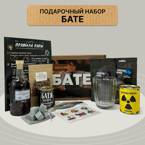 В комплект входят: чай черный, кружка — 500 мл, специи для приготовления коньяка, бутылка с наклейкой — 0.5 л, камни для охлаждения крепких напитков в бархатном мешочке из стеатита — 6 шт, вяленое мясо "Оленина" и "Страус" — по 20 г, мыло в форме рыбы, батины носки в банке, плакат «Правила папы» — это вам не шутки.